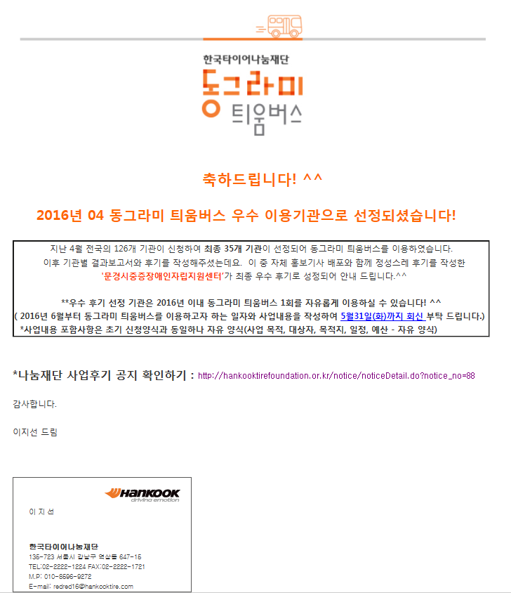 2016. 4월 한국타이어나눔재단 틔움버스 우수 이용기관 선정 관리자 0 19409 2016.05.23 13:27 2016년 4월에 한국타이어나눔재단으로부터 틔움버스를 지원받아 이용자들과 부모들이 함께 한 현장학습을 실시하였다. 실시하고 결과 및 이용후기를 제출하였는데, 우수 이용기관으로 선정되어 추후 1회 틔움버스를 이용할 수 있게 되었다.
