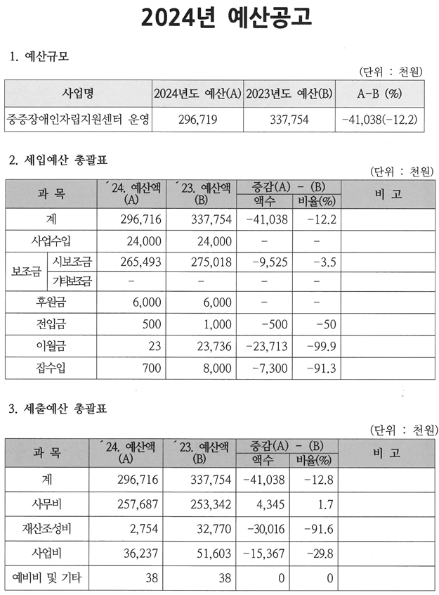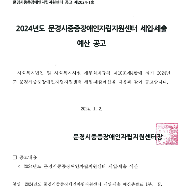 2024년도 문경시중증장애인자립지원센터 예산공고