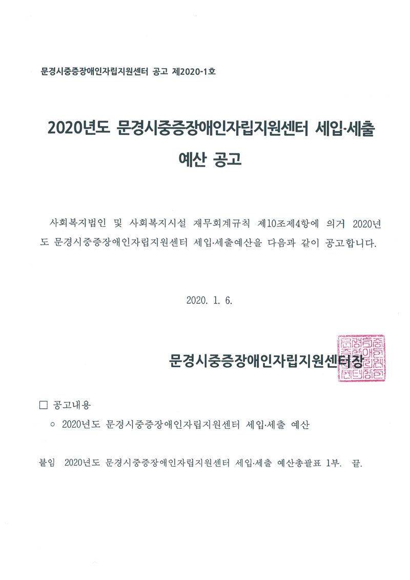 2020년 문경시중증장애인자립지원센터 예산 공고 관리자 0 8276 2020.01.06 18:36 2025.09.01 05:54 2020년 문경시중증장애인자립지원센터 예산내역서.pdf.zip (931.9K) + 0 .