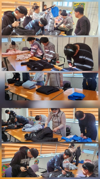 계절에 맞는 옷차림, 의류(상의, 하의, 속옷, 양말 등) 개는 방법 등 의복 관리 교육 실시하였습니다.