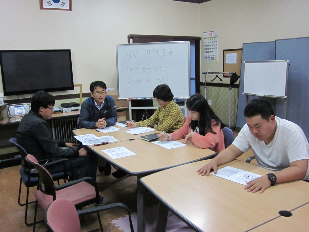 제3차 직원교육 실시 (개인정보보호) - 10. 17(목) 최고관리자 0 1790 2013.10.18 10:27 센터직원들을 대상으로 센터 이용자 및 후원자, 자원봉사자, 직원 등의 개인정보에 대한 수집 및 관리에 대한 직원교육을 실시하였습니다.