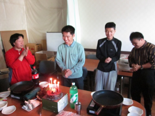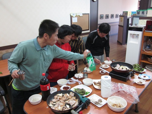 생일을 맞이하여 점심 식사로 삼겹살과 오리를 구워 먹었습니다.