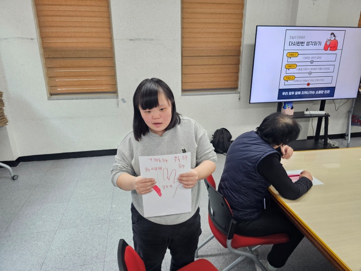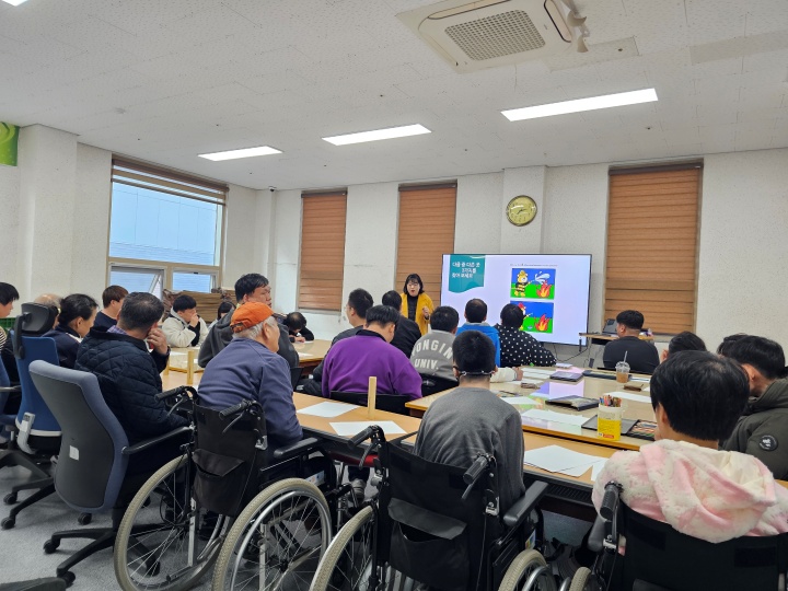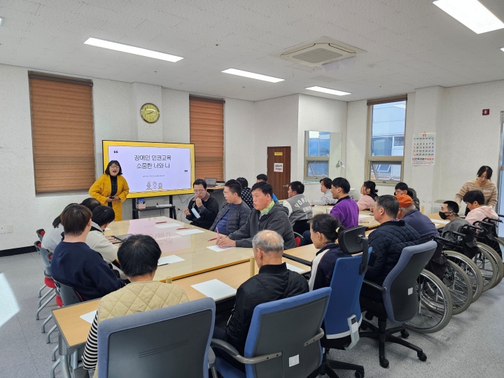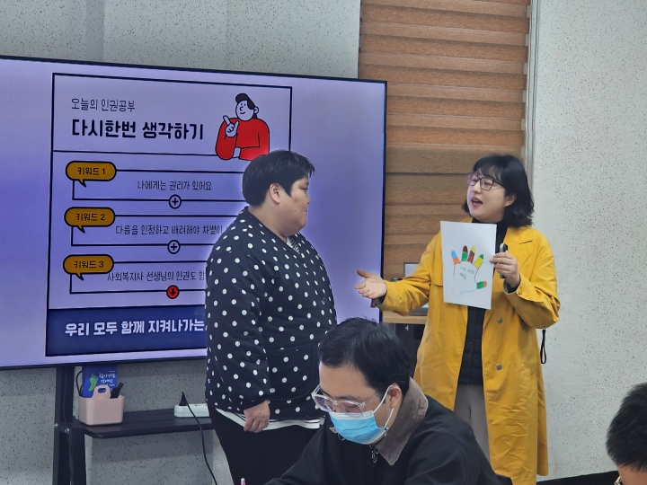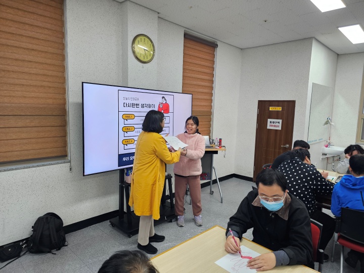 이용자역량강화교육(인권교육) 실시 류인하 0 85 11.18 17:27 센터에서는 센터 이용자를 대상으로 11월 12일(수요일) 센터 공동작업장에서 이용자 인권 및 자기결정권 향상을 위한 인권교육을 실시하였습니다.