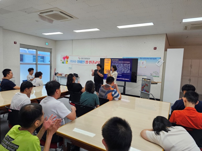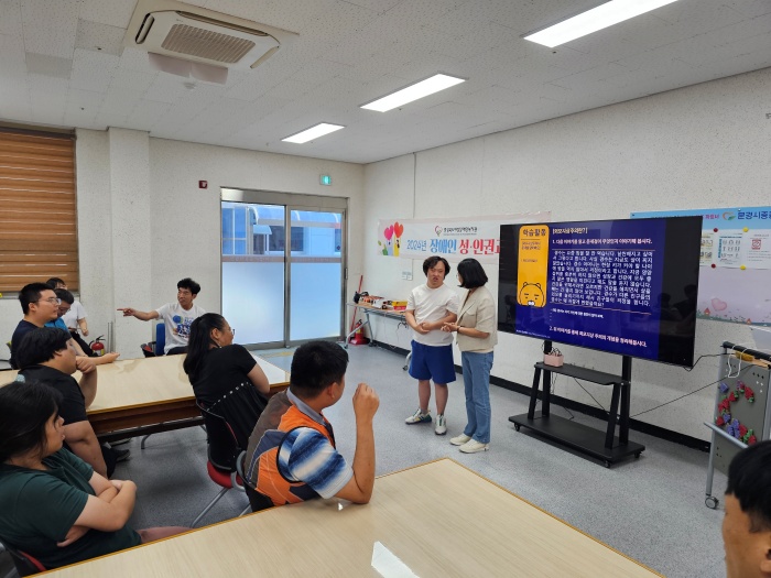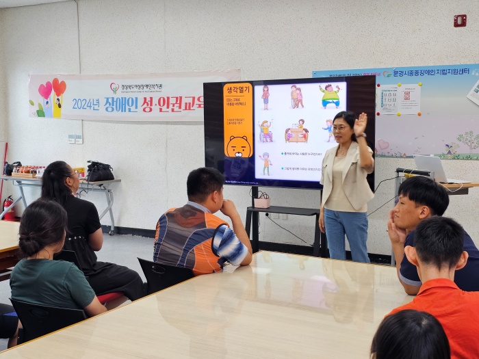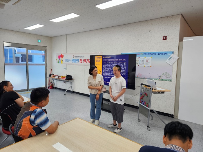 제4차 이용자 역량강화교육 실시 최고관리자 0 808 2024.07.17 20:15 ○ 일 시 : 2024. 7. 17.(수) 14:00~15:00 ○ 주 제 : 제4차 이용자 역량강화교육(4대 폭력 예방교육) ○ 강 사 : 권내영 (경북지적발달장애인복지협회 예천군지부장) 경상북도여성장애인복지관에서 강사를 지원받아 센터 이용자를 대상으로 4대 폭력 예방교육을 실시하였습니다. 4대 폭력이란 성폭력, 가정폭력, 성희롱, 성매매를 뜻하며, 오늘 교육을 통해 이와 같은 문제가 발생하였을 경우 적절하게 대처할 수 있도록 안전과 관련된 뜻깊은 배움의 시간을 갖게 되었습니다.