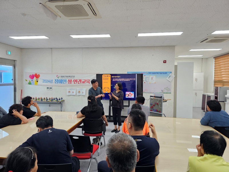제5차 이용자 역량강화교육 실시 최고관리자 0 850 2024.07.25 08:57 ■ 제5차 이용자 역량강화교육 실시 ○ 주제 : 성인권교육 ○ 강사 : 권내영강사 센터에서는 24일(수)에 이용자의 자기결정권과 성인권 감수성을 향상시키기 위하여 제5차 이용자 역량강화교육을 실시하였습니다. 이용자 눈높이에서 진행된 교육을 통해 자연스럽게 강사의 질문에 스스로의 목소리를 내어 타인에게 전달할 만큼 자기주장이 뚜렷한 모습을 보이며, 모두가 만족할 수 있는 교육이 진행된 것으로 생각됩니다.